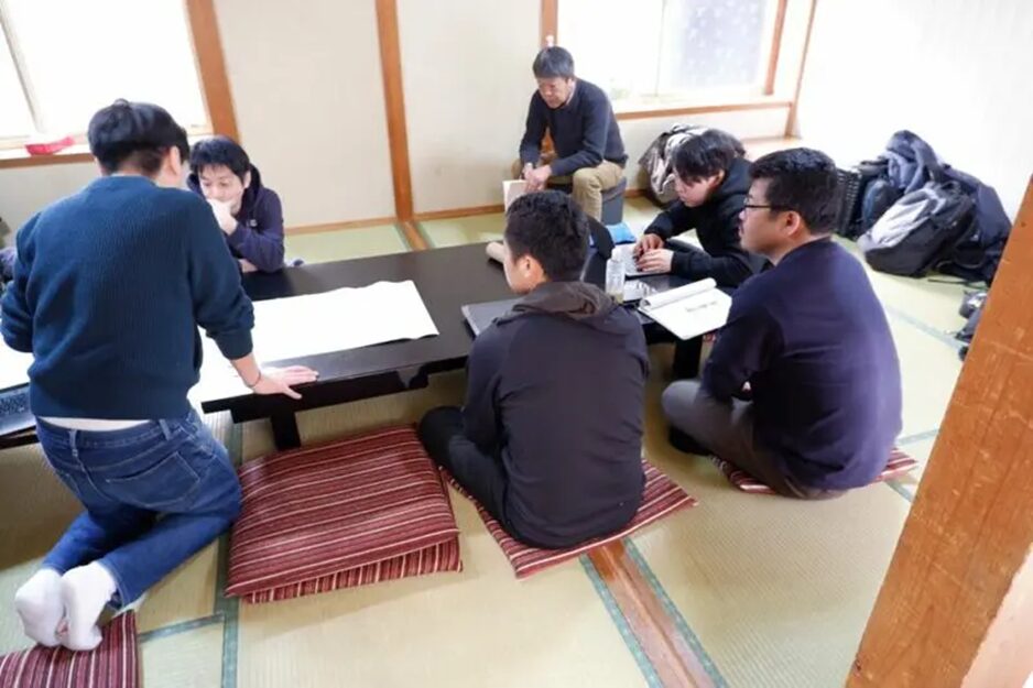 宿の食事用のスペースで会議を行う様子